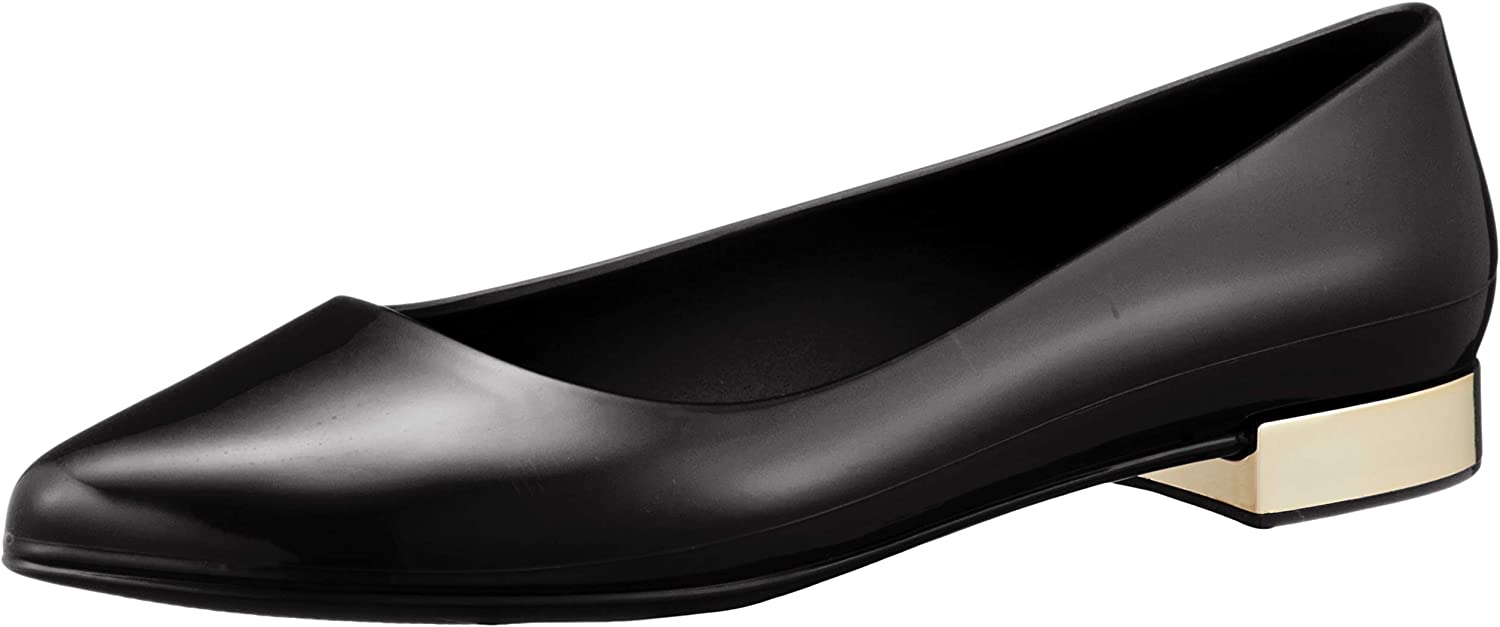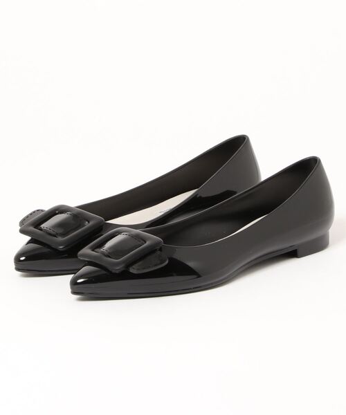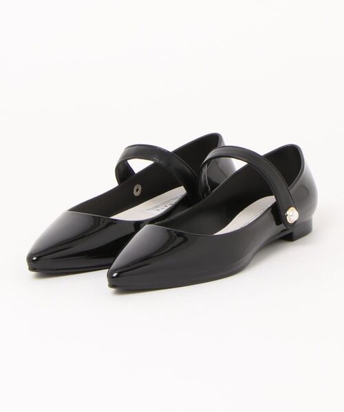 光沢感のあるエナメル風素材とポインテッドトゥがレディライクな印象を与え、変形マーブル柄のパーツがアクセントとなっています。雨の日はもちろん、晴れの日にも違和感なく履きこなせる洗練されたデザインです。