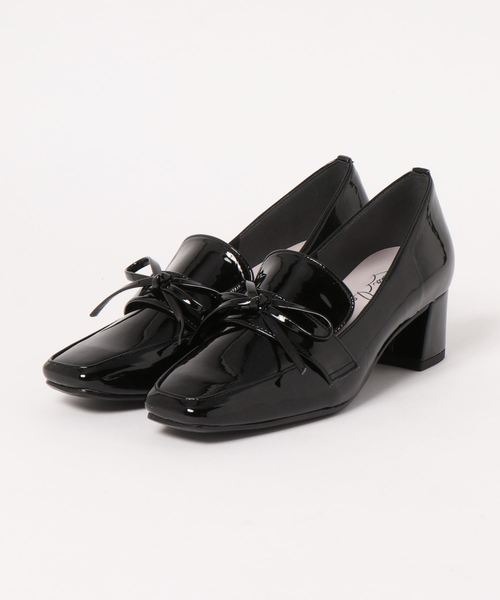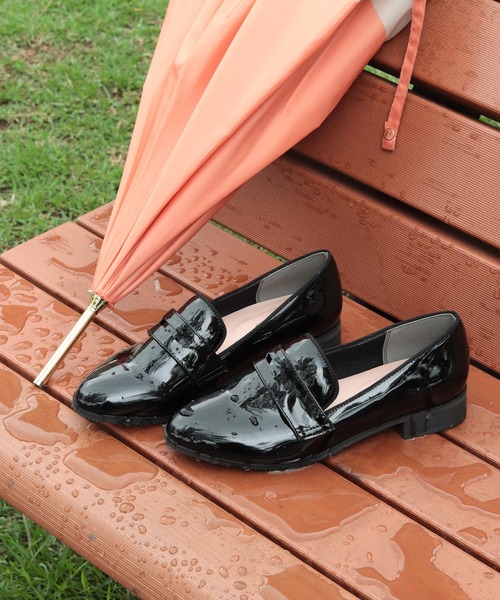 ツヤ感のあるエナメル素材が、きちんと感を引き立てるレインパンプスです。ローファーデザインにリボンモチーフを合わせ、女性らしさを演出します。