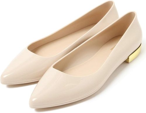 甲浅デザインで、指の付け根が隠れる程度のカットが施されており、ロングパンツとの相性も抜群。ヌーディーで大人っぽい足元を演出するこのレインパンプスは、雨の日でもおしゃれを楽しみたい方に最適な一足です。